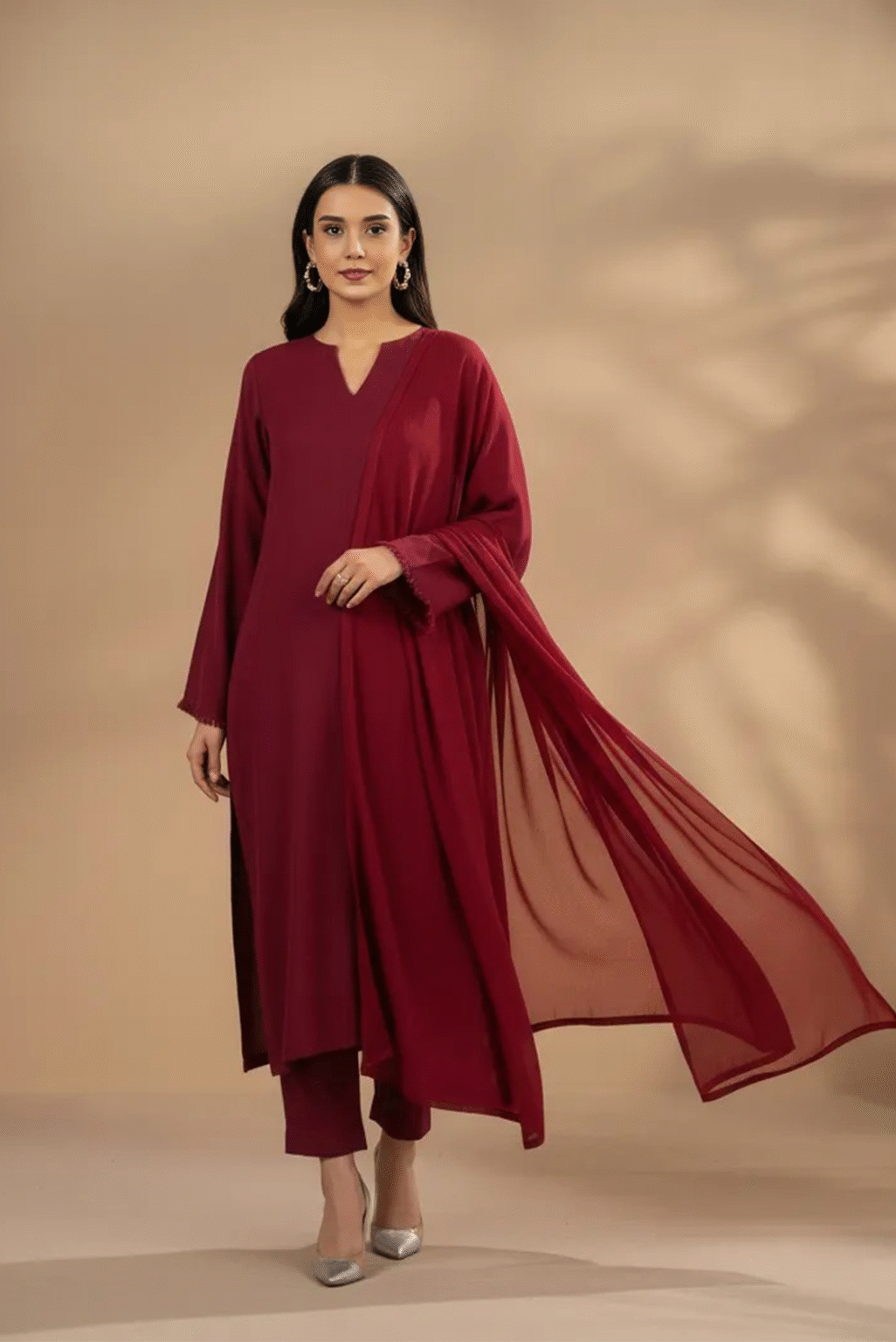 Elevate your winter wardrobe with “Yaqoot Maroon Burgundy” by Qaswa Eman — a luxurious karandi stitched dress blending comfort, warmth, and timeless elegance. Perfect for a rich, refined winter look. Shop now!
